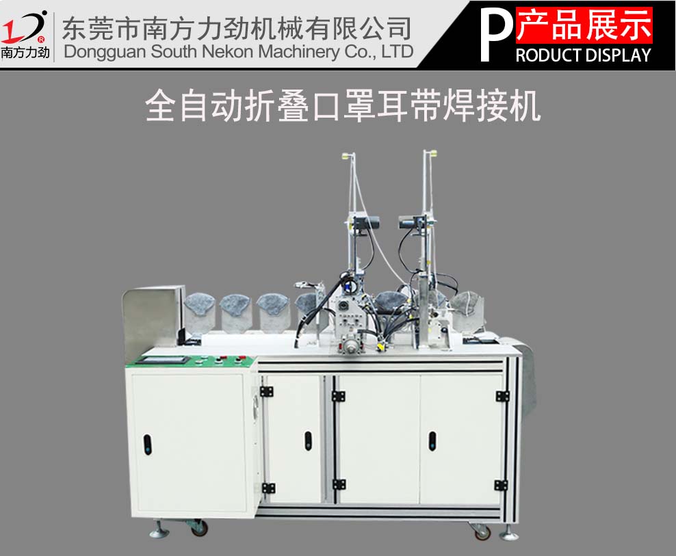 目前市場上折疊口罩均采用手動熔接都需人工一片一個點波熔接,產能只有3個/分鐘,生產效率較低,且廢品率高。南方力勁機械有限公司新研發制造了全自動折疊口罩耳帶焊接機,需要一個操作員將口罩本體(片體)一片一片放入送帶夾具上,機械后續動作至成品皆由機臺自動操作完成,效率高,每分鐘可達25-30個。