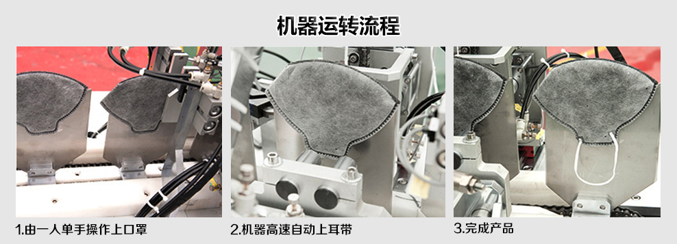 本機采用鋁合金材料,外觀美觀大方。PLC微電腦控制,具有折疊型口罩本體(片體)輸送系統和耳帶旋轉